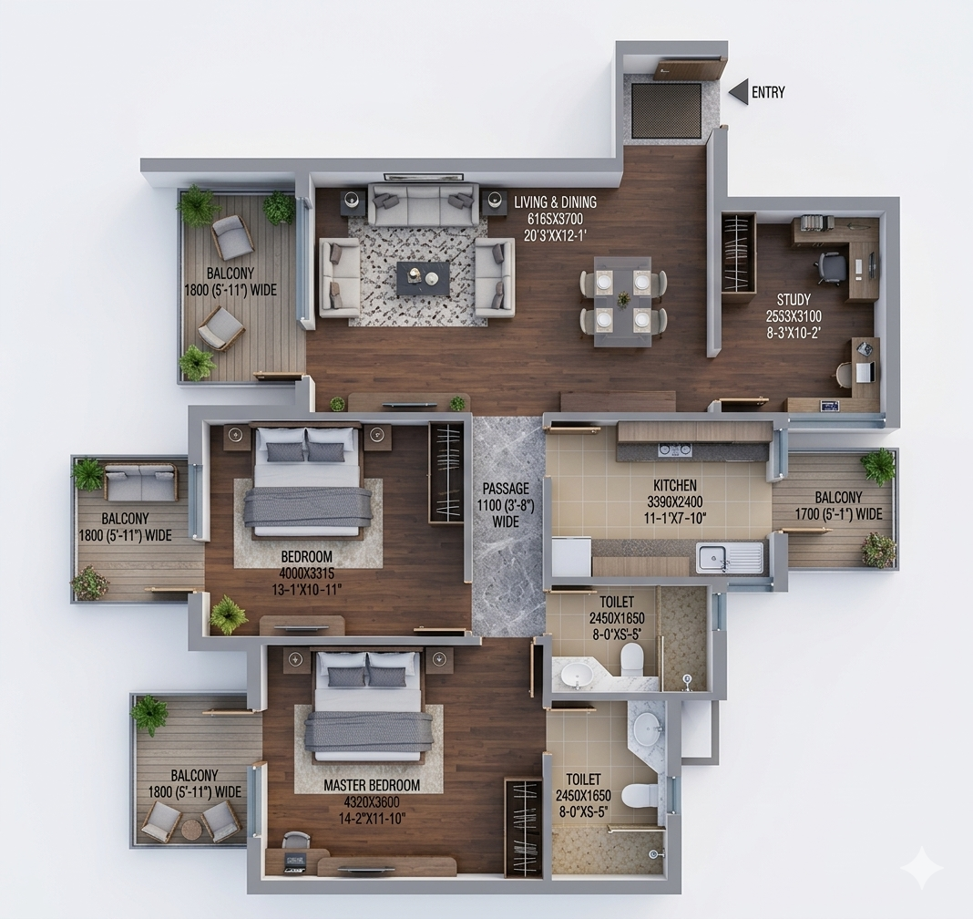 The presence of a study room adds flexibility, allowing use as a home office, guest room, or additional functional space.