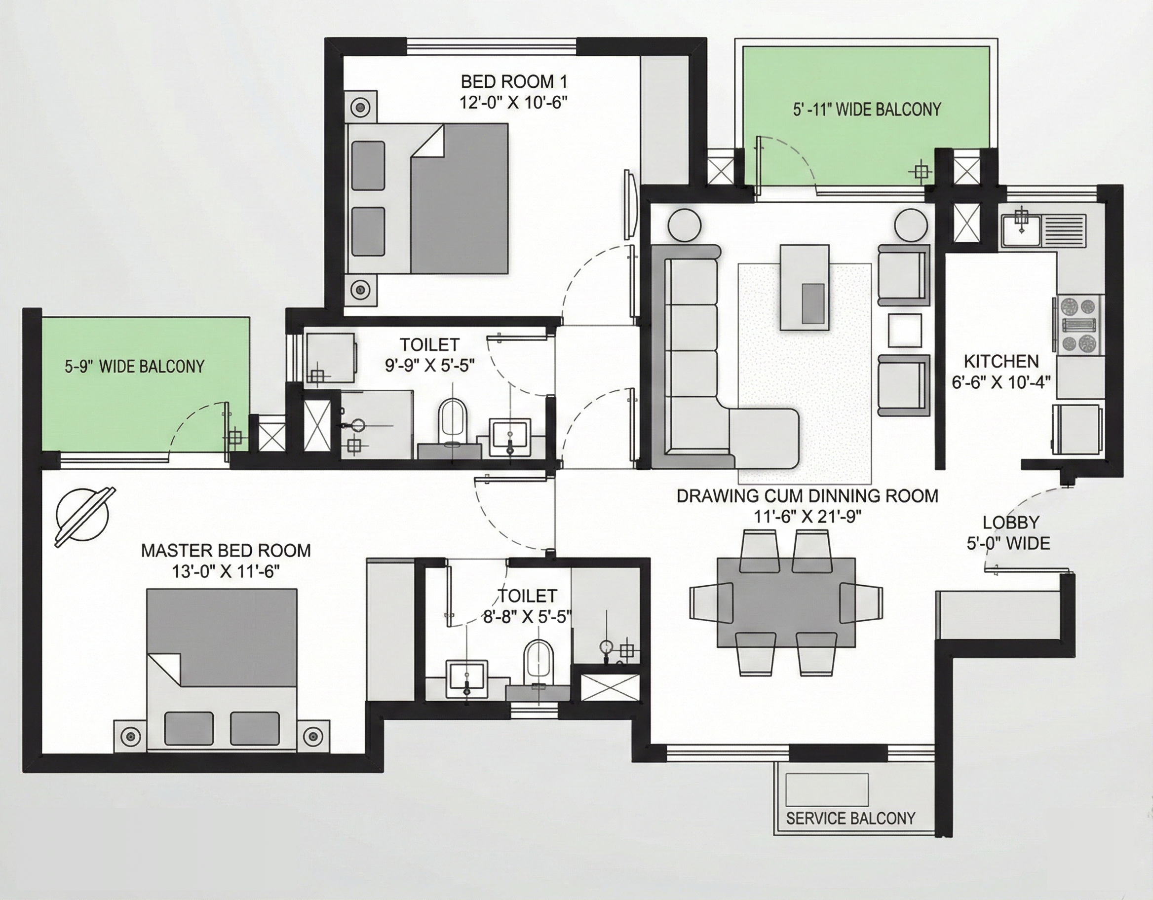 The unit is designed with a focus on efficient space utilization, natural ventilation, and ample sunlight, ensuring a comfortable living environment. The presence of balconies enhances airflow and provides outdoor space for relaxation. The layout includes a well-defined living and dining area along with a practical kitchen setup, making daily living convenient and organized.