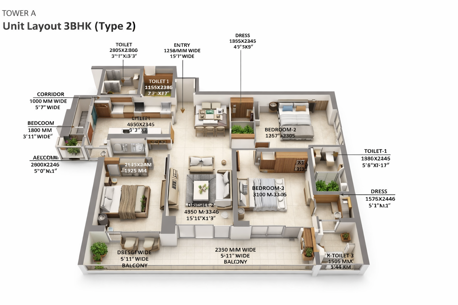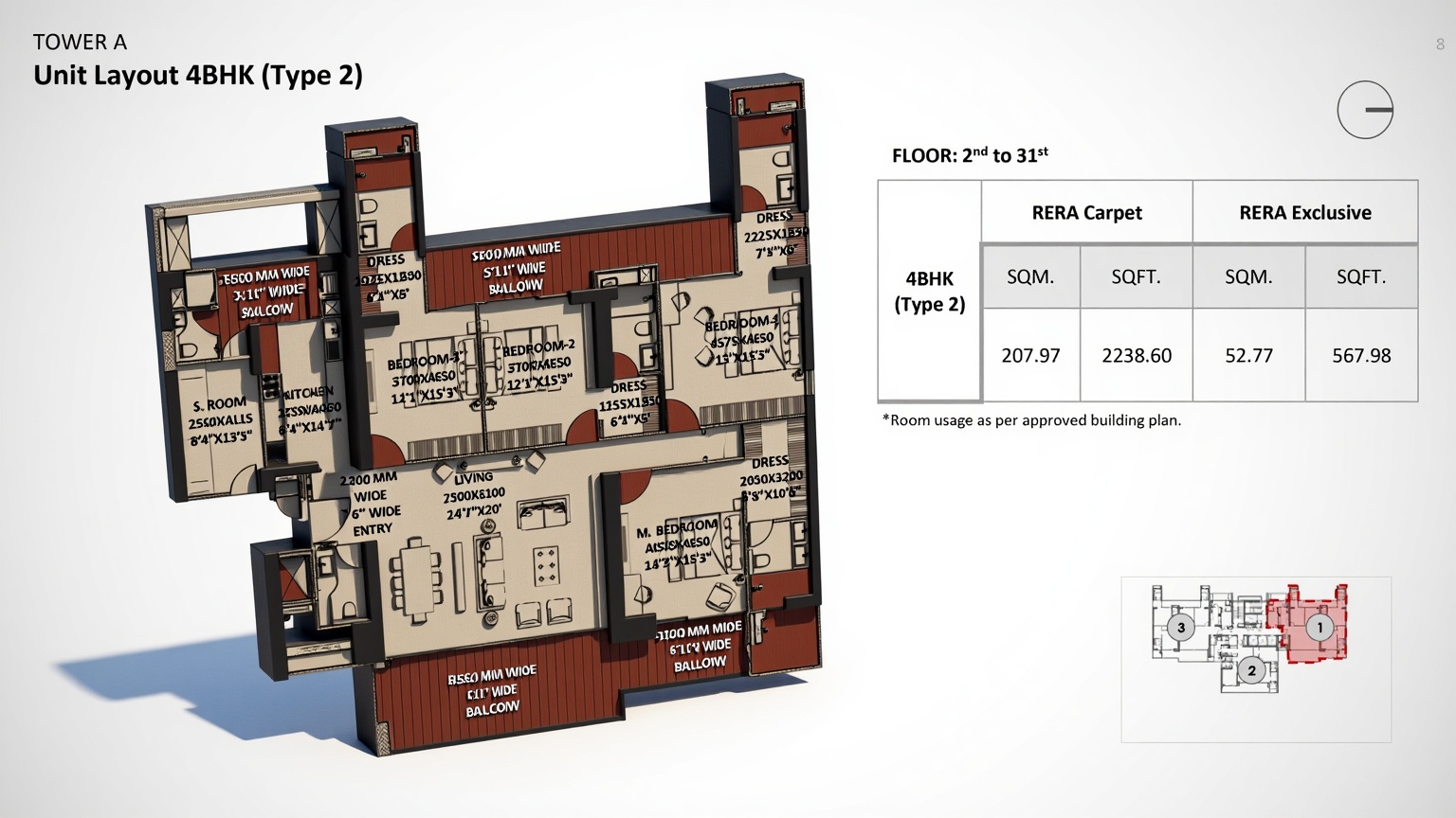 The project offers 3 BHK and 4 BHK luxury apartments, along with some larger premium configurations.